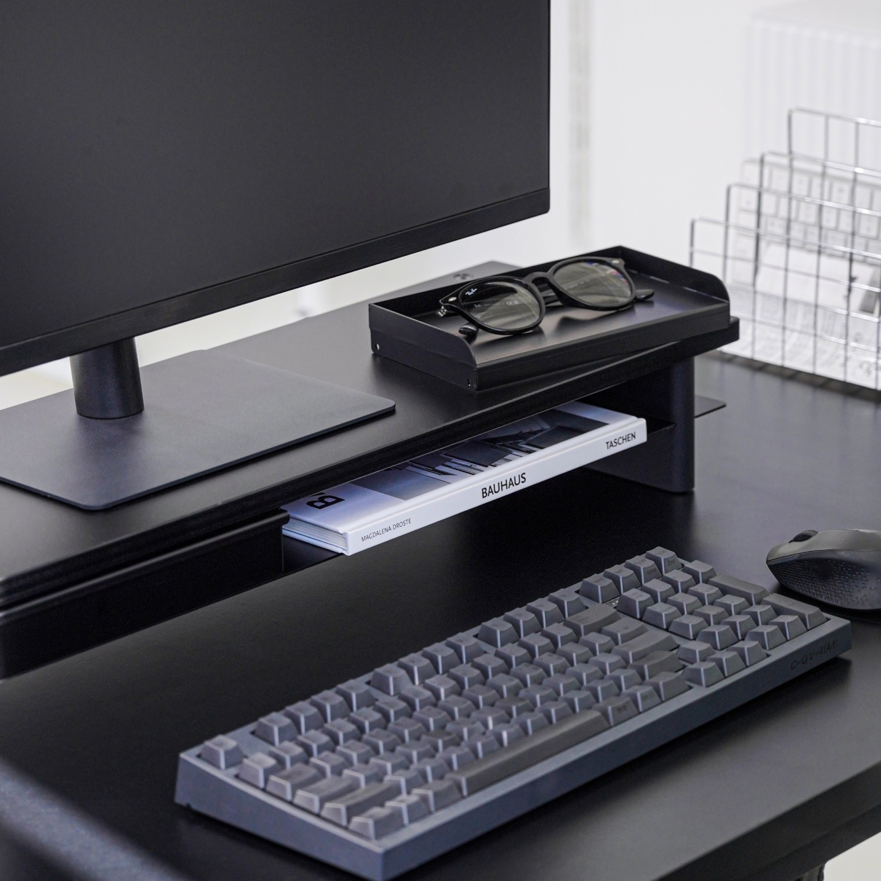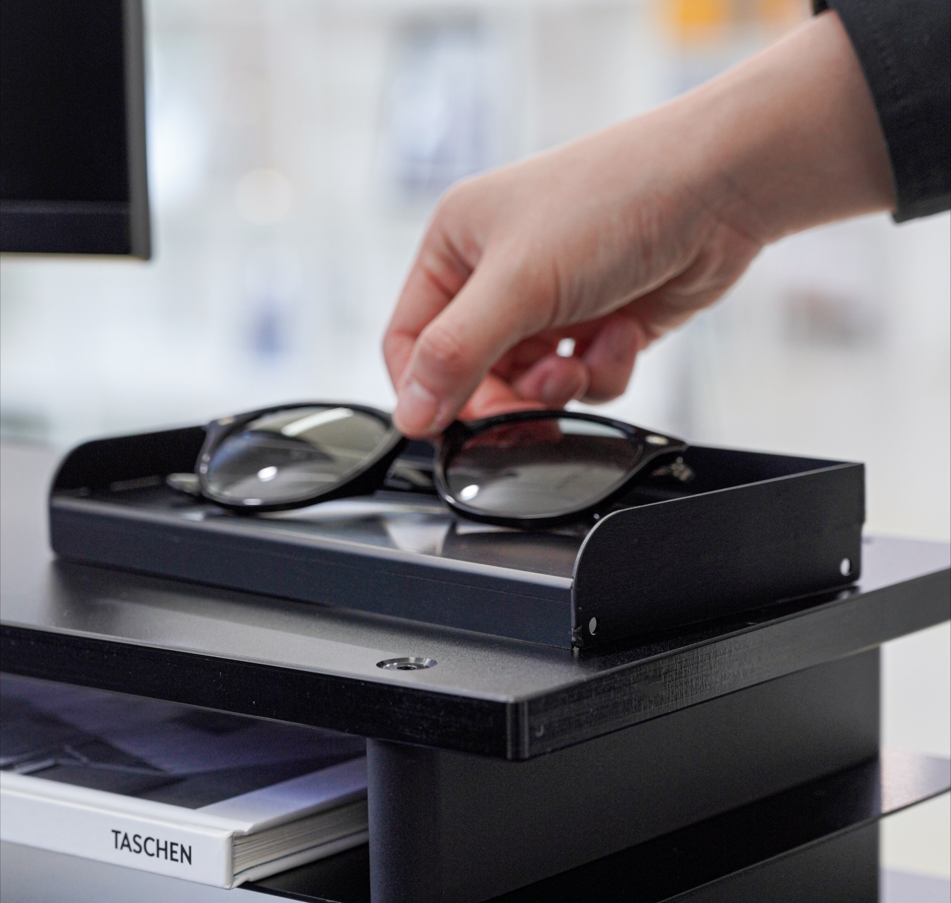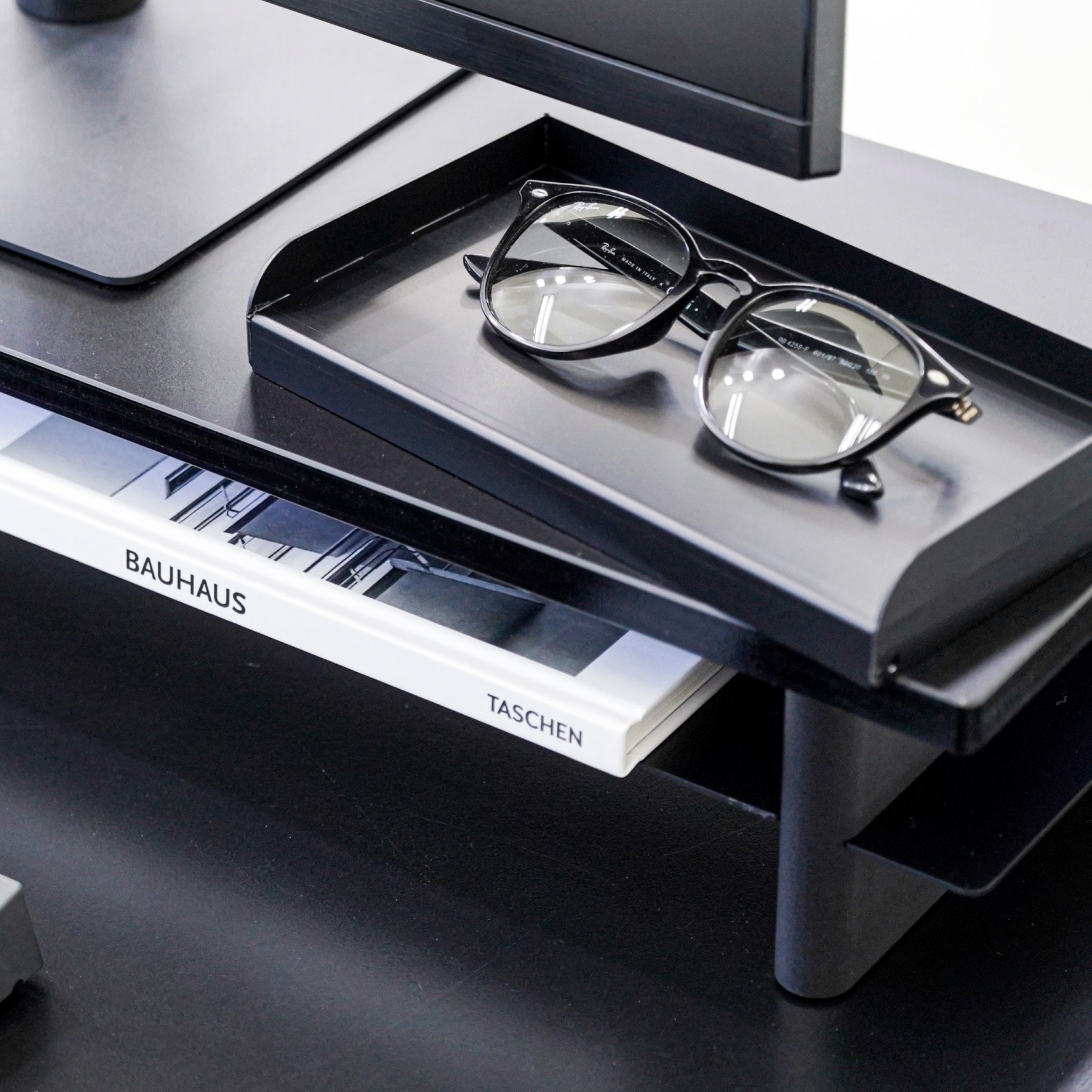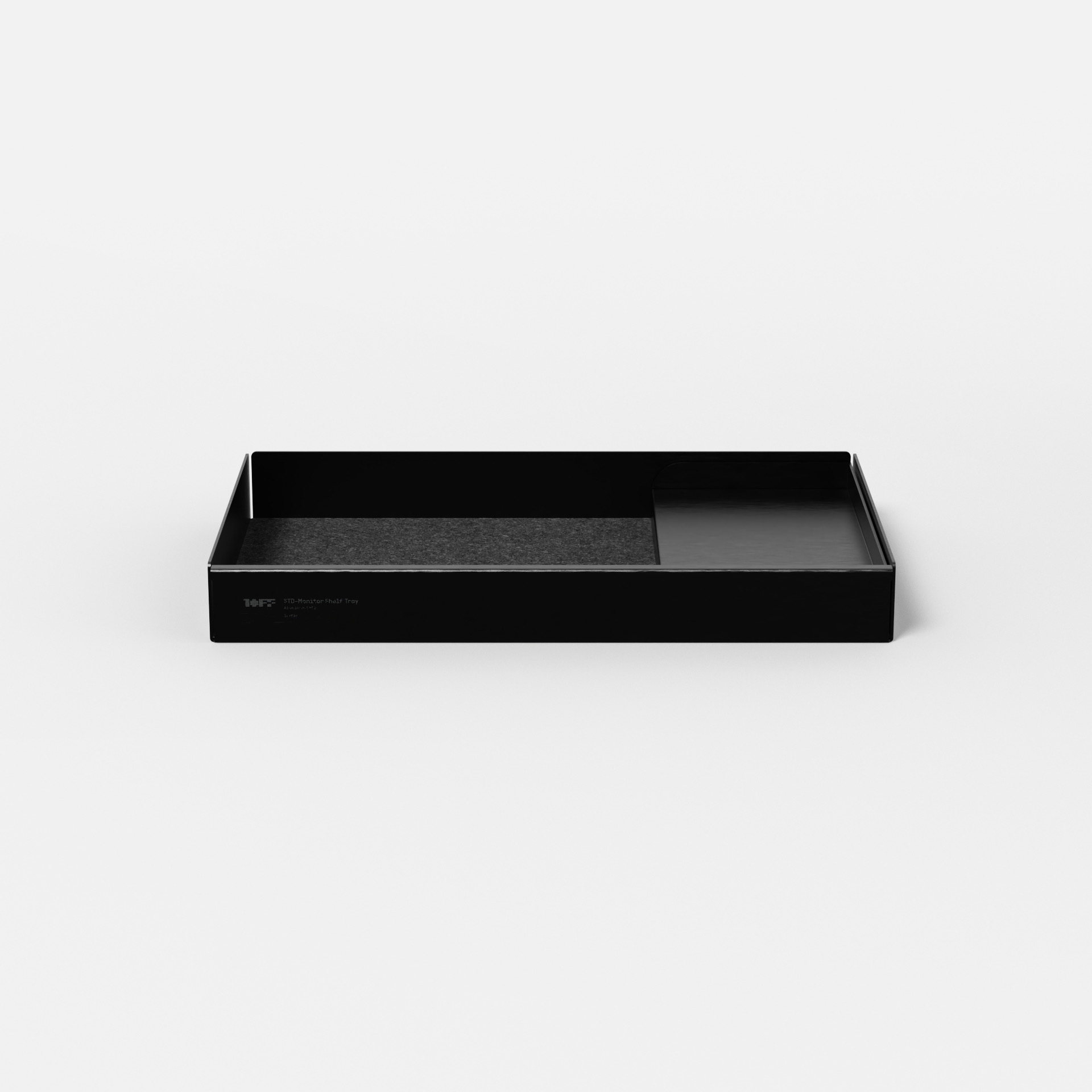 An aluminum inner tray designed to pair seamlessly with the Monitor Shelf Tray.